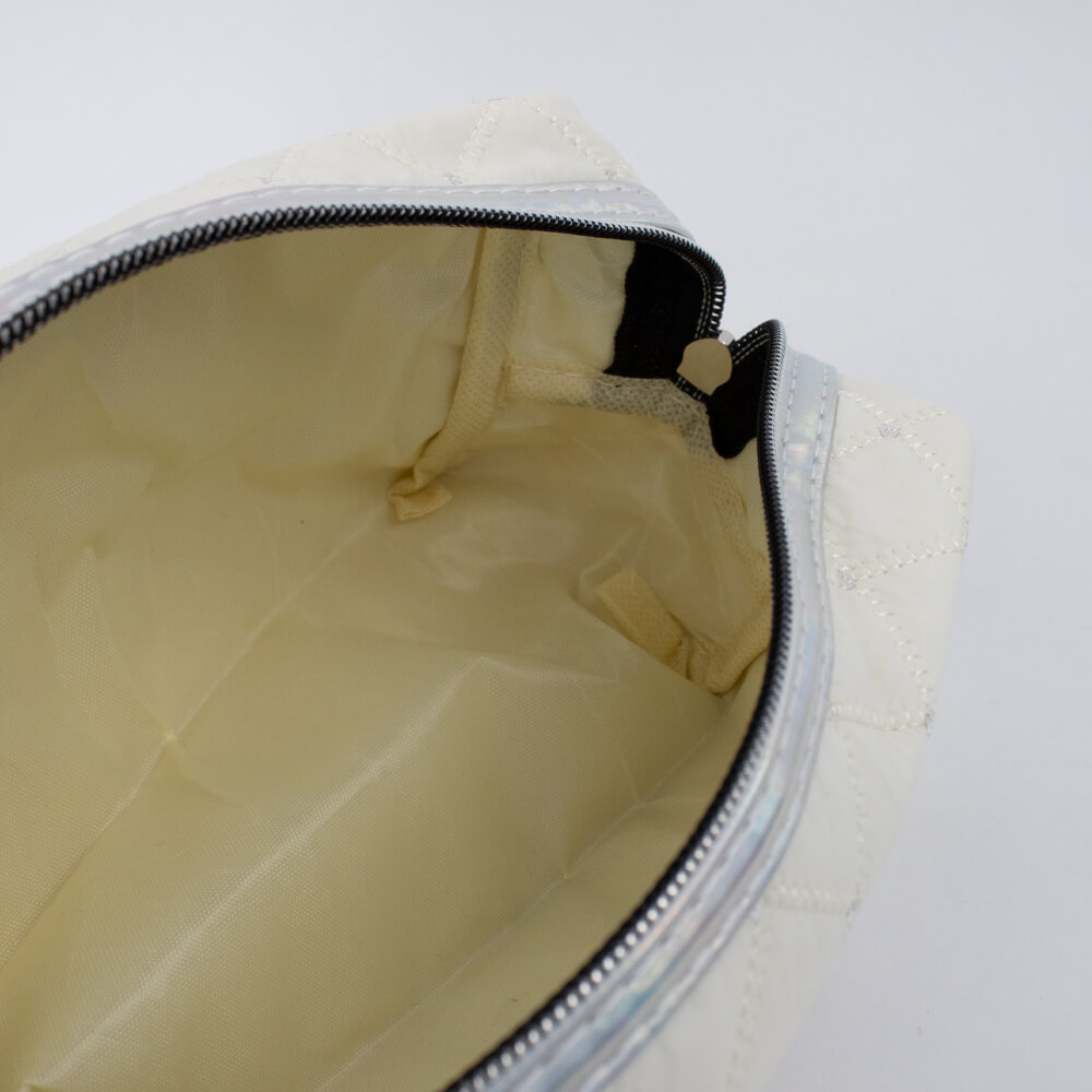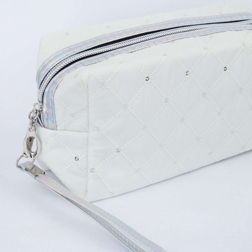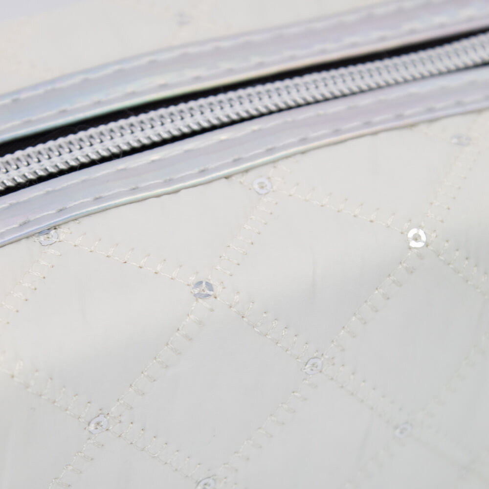 Porta cosméticos con estampado de lentejuelas, y cierre de cremallera con tira cierres.