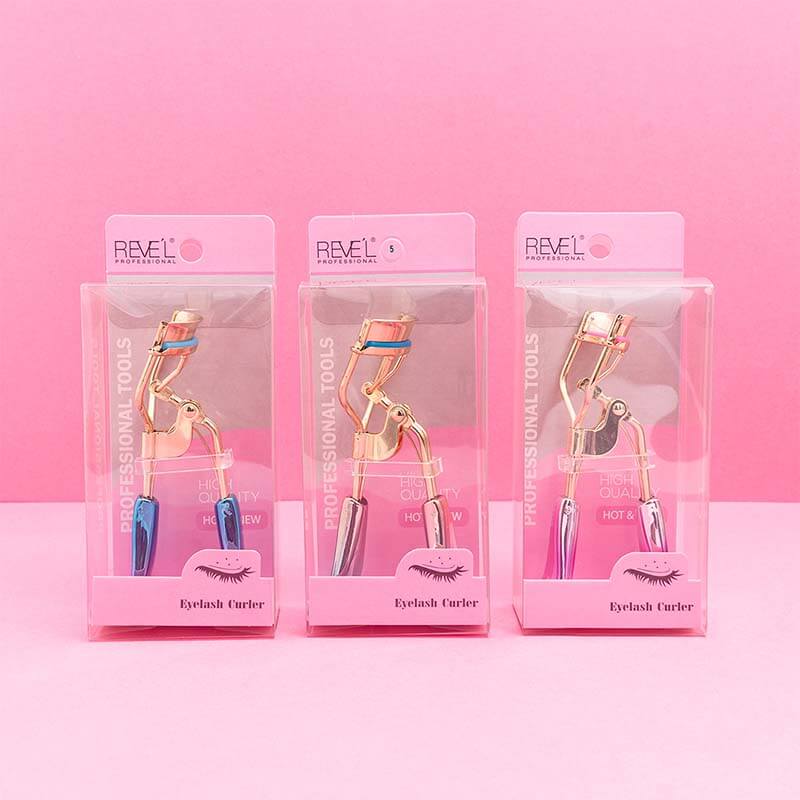 Practico rizador de pestañas con resorte con mango de acrilico de colores tornasolados.