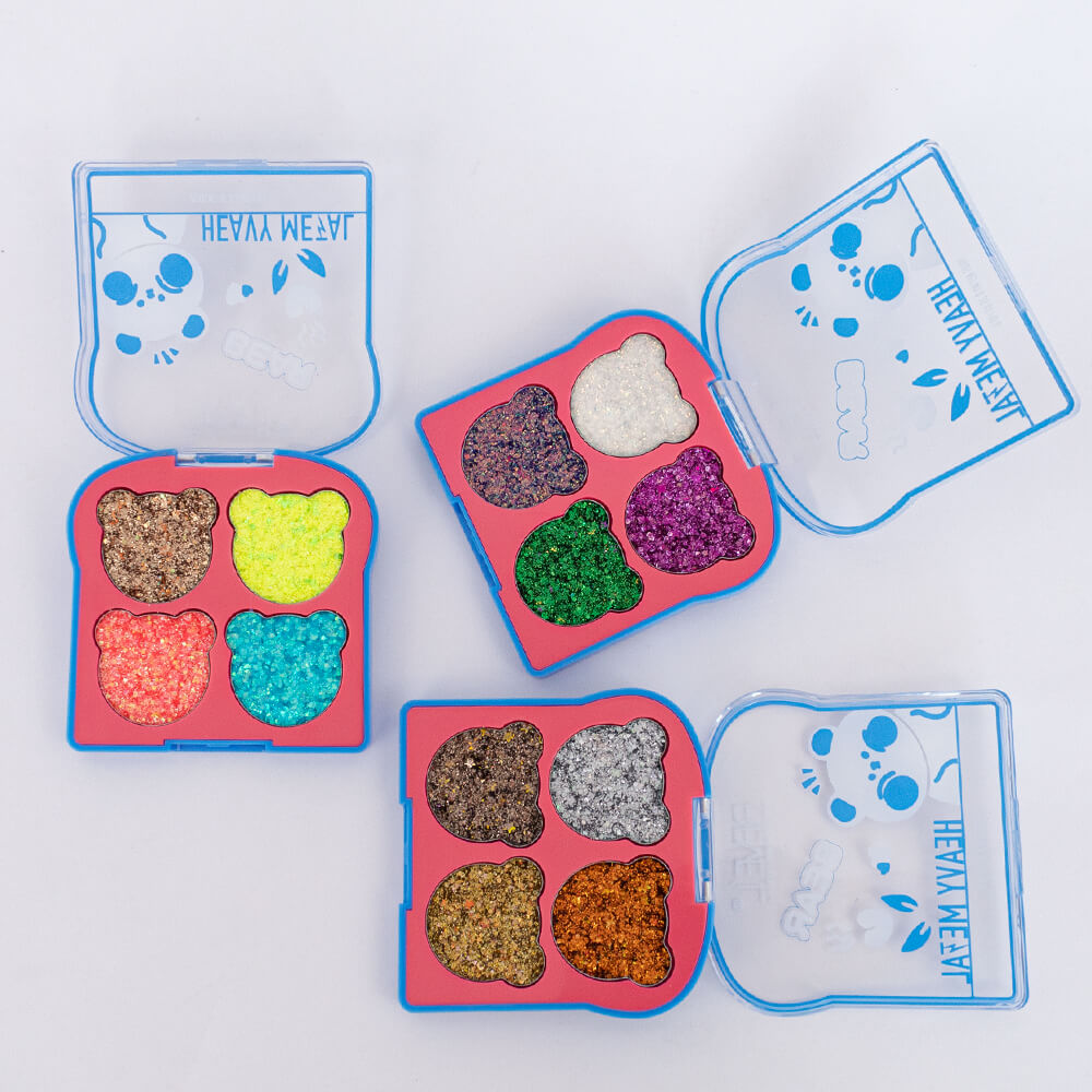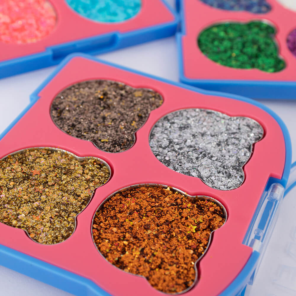 Paleta de glitter prensado o sombras escarchadas para un maquillaje único y reluciente.